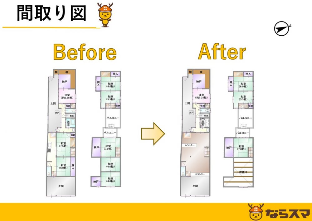 ・DK-和室6帖-和室7.5帖:間仕切り壁解体工事、床フローリング上張り工事