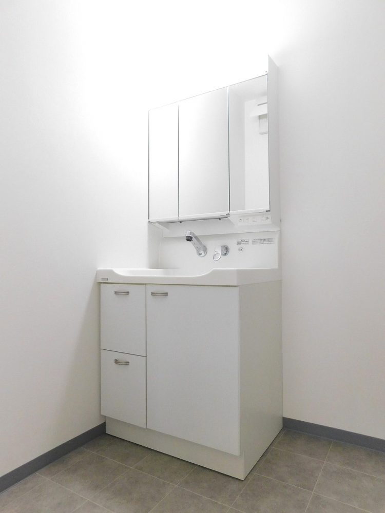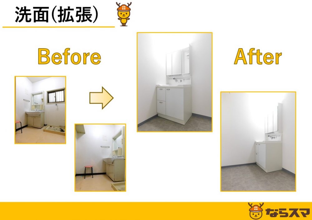 ・洗面:洗面化粧台移設工事、洗濯水栓入替・防水パン⇒排水口変更工事、建具交換