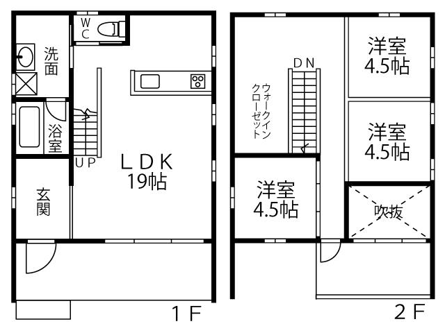 間取り | 2SLDK | 間取り内訳 | 1FLDK19畳×1室 2F洋4.5畳×1室 2F洋9畳×1室 2FS4畳×1室 |