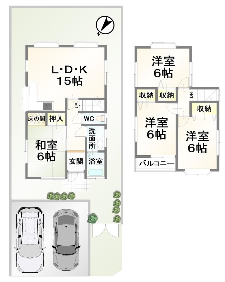 | 間取り | 4LDK | 間取り内訳 | 1FLDK15畳×1室 1F和6畳×1室 2F洋6畳×3室 |