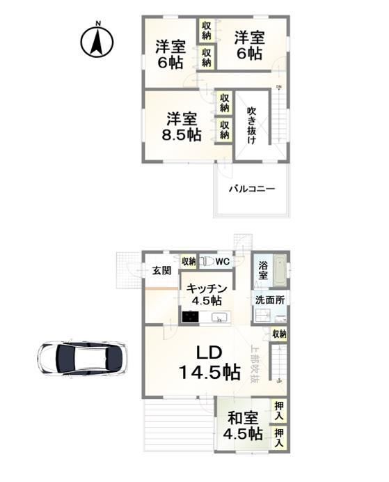 | 間取り | 3LDK | 間取り内訳 | 1FLDK19畳×1室 1F和4.5畳×1室 2F洋6畳×2室 2F洋8.5畳×1室 |