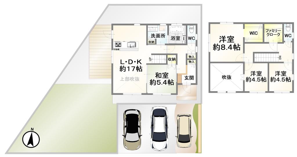 | 間取り | 4SLDK | 間取り内訳 | 1F和5.4畳×1室 1FLDK17畳×1室 2F洋8.4畳×1室 2F洋4.5畳×2室 |