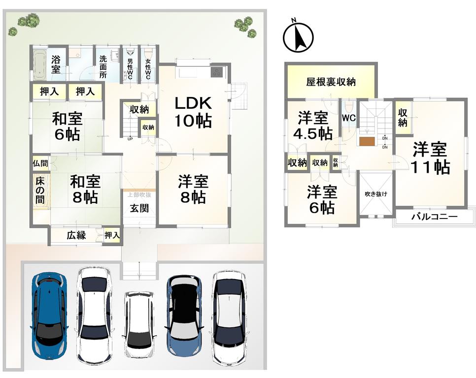 | 間取り | 6LDK | 間取り内訳 | 1FLDK10畳×1室 1F洋8畳×1室 1F和6畳×1室 1F和8畳×1室 2F洋11畳×1室 |