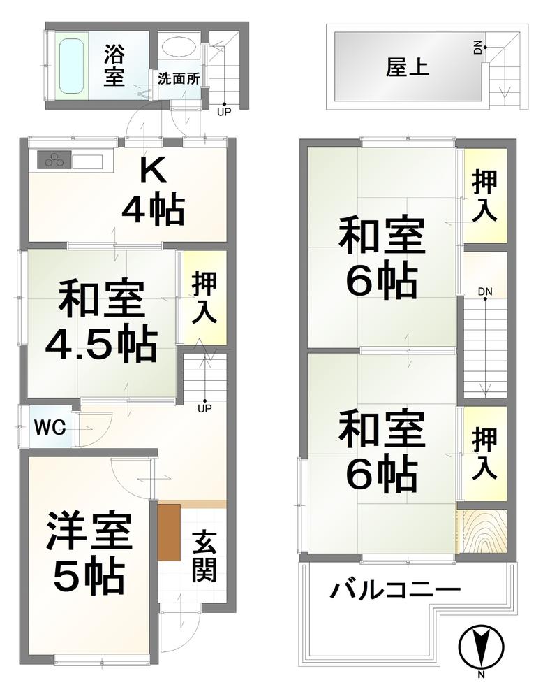| 間取り | 4K | 間取り内訳 | 1FK4畳×1室 1F和4.5畳×1室 1F洋5畳×1室 2F和6畳×2室 |