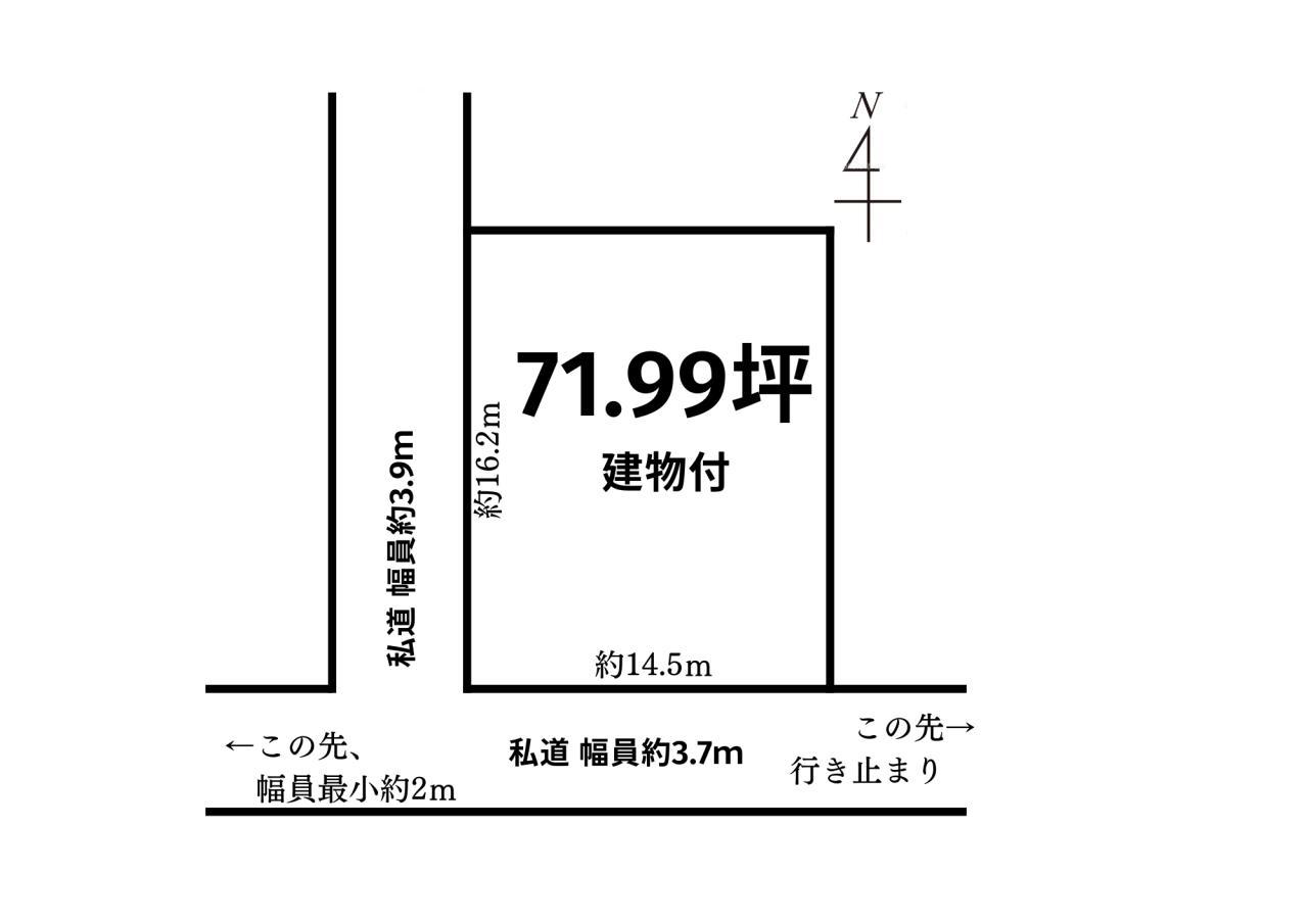 | 接道状況 | 西3.9m 私道 接面16.2m 南3.7m 私道 接面14.5m 角地 | ||